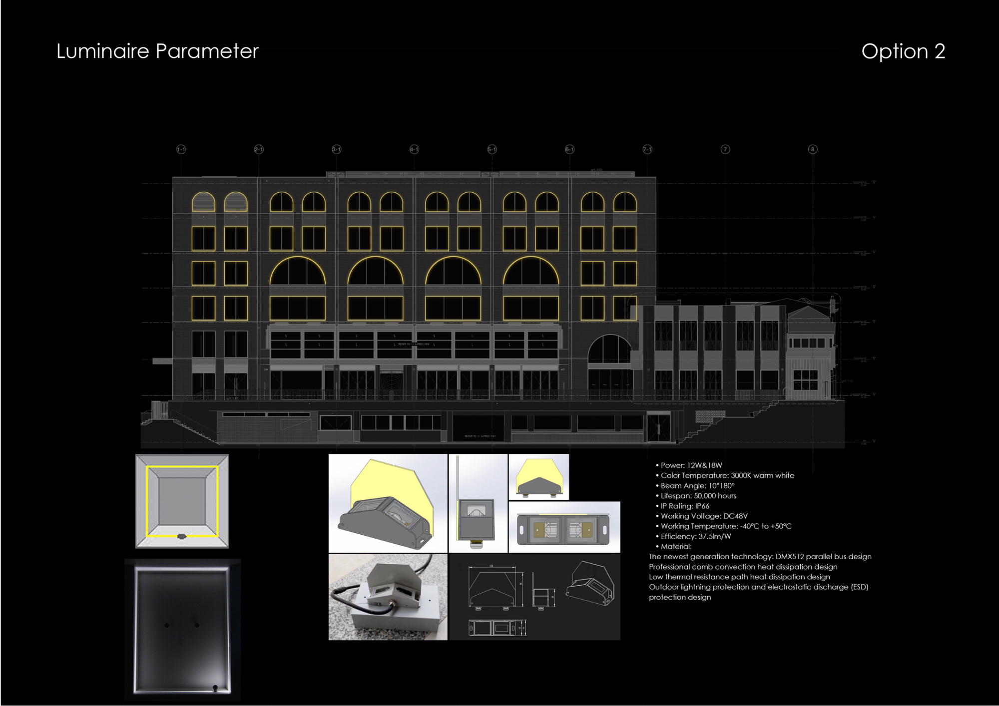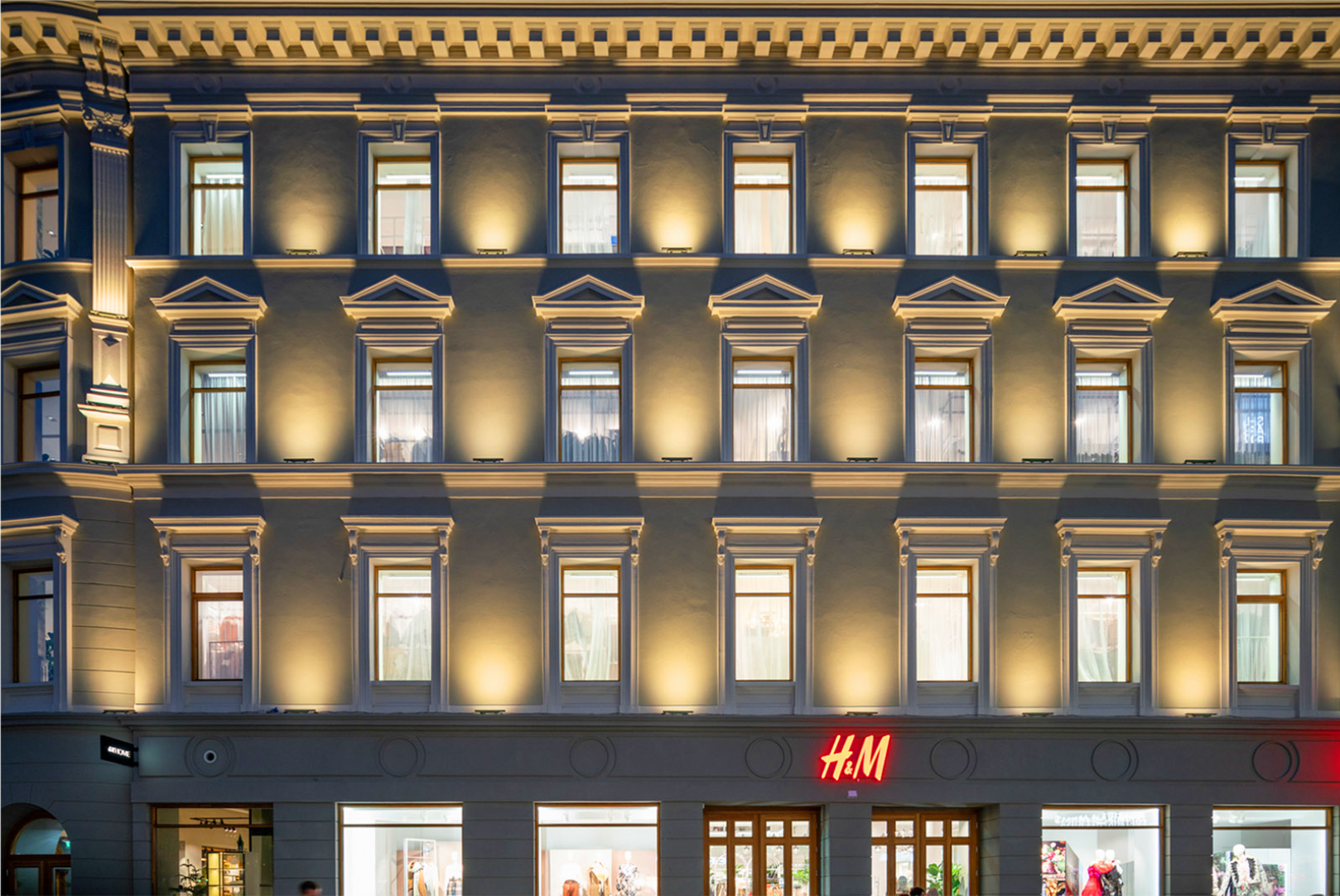 The overall concept focused on creating a refined and engaging night-time façade through a layered lighting approach, balancing ambient illumination with precise accent lighting. The goal was to elevate the visual impact of the building while contributing to a welcoming and vibrant urban environment.