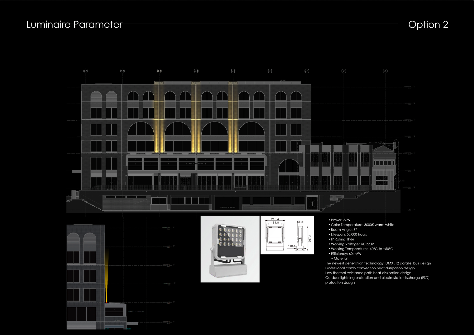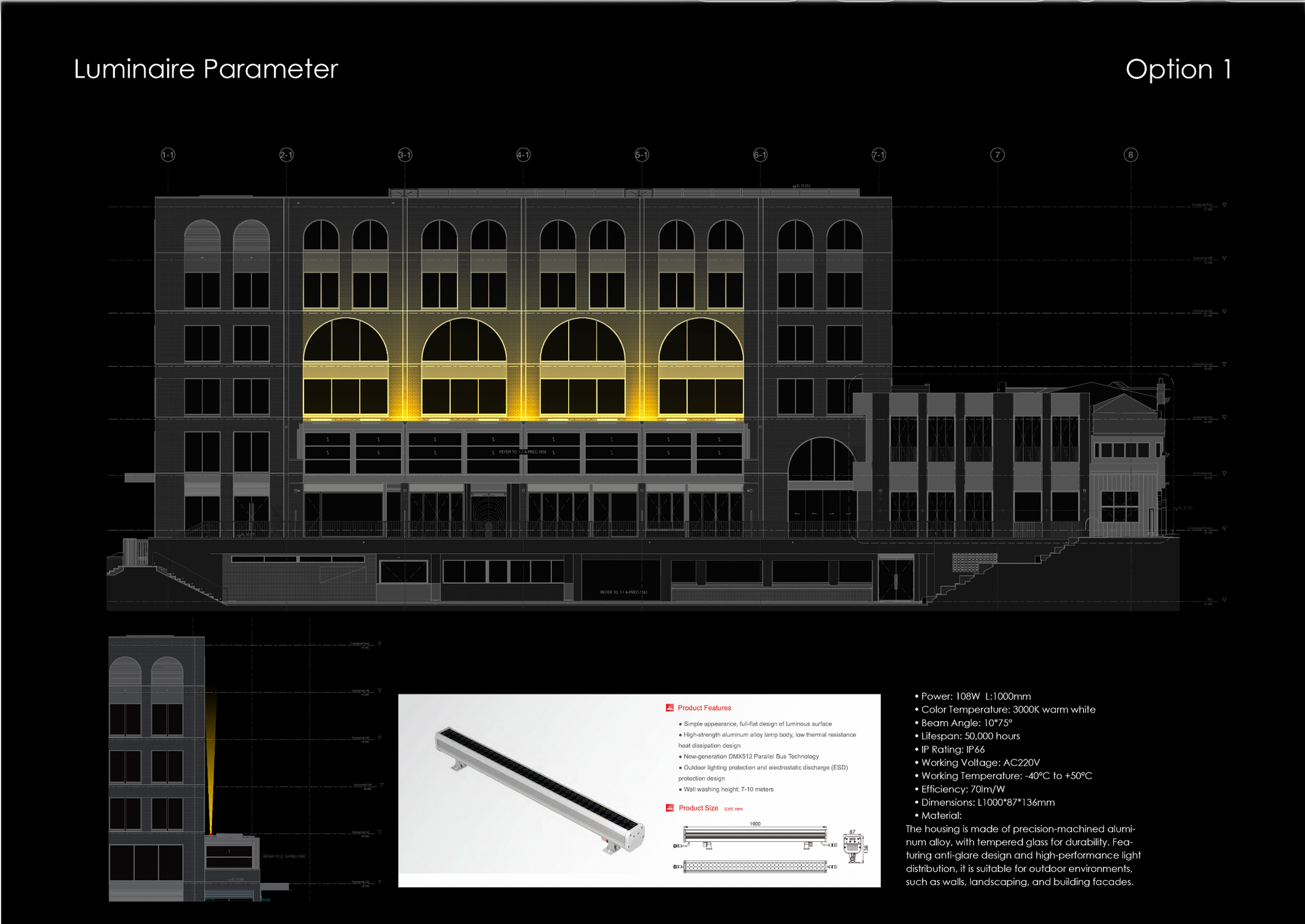 Architectural façade lighting design for mixed-use development