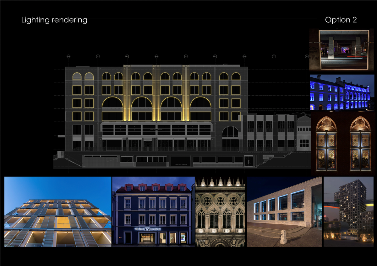 At the early stage of the project, we developed a lighting concept centred on a layered façade approach, aiming to enhance the building’s architectural rhythm and nighttime identity. By combining ambient illumination with targeted accent lighting, we created a balanced scheme that highlights key structural elements while maintaining overall visual harmony.