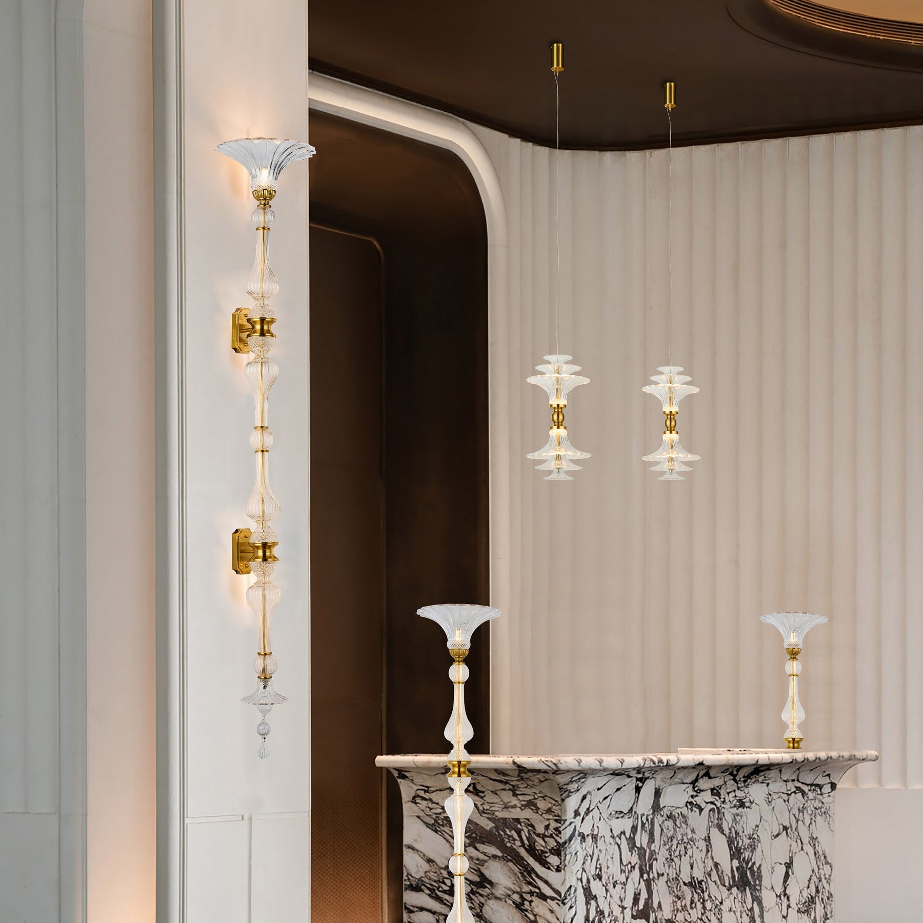 The Petaluxe B1A Wall Light adds vertical elegance and timeless charm to your walls. Featuring dual segments of sculptural handmade glass with brass accents, it brings layered illumination to hallways, bedrooms, or luxury reception areas. An ideal pairing piece for tall spaces or mirror flanks.