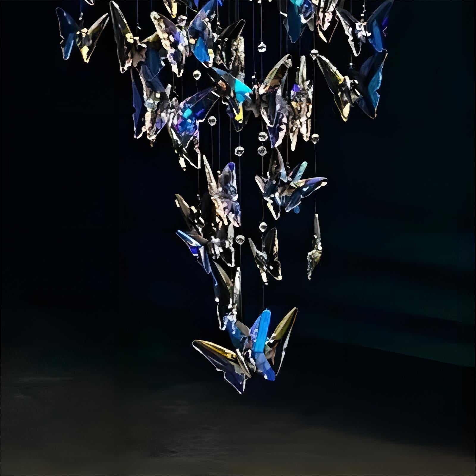 Each butterfly is meticulously handcrafted from premium crystal, delicately suspended from fine cables that create a fluid, cascading formation. The result is a stunning interplay of light and reflection — perfect for stair voids, hotel lobbies, or private residences seeking a touch of wonder.