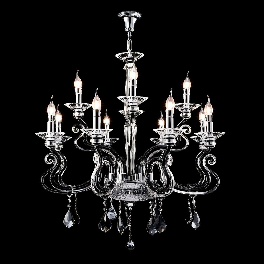 - The chandelier features a chrome finish, which complements the crystal accents and enhances its reflective qualities.