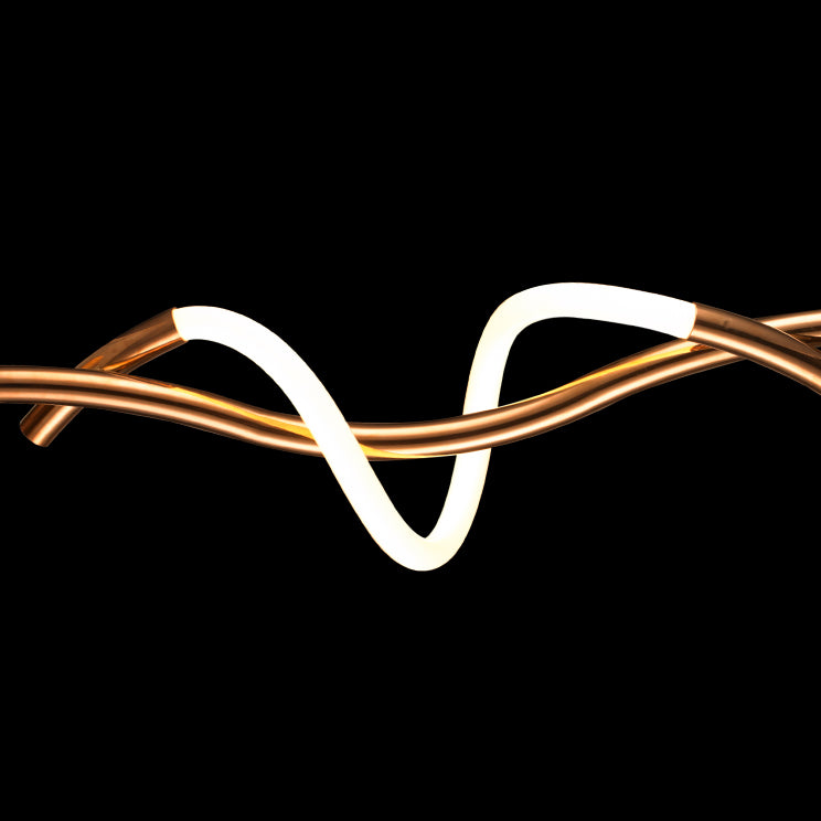 An interplay of rigid stainless steel and flowing LED tubing comes together to create the ultimate feature light.