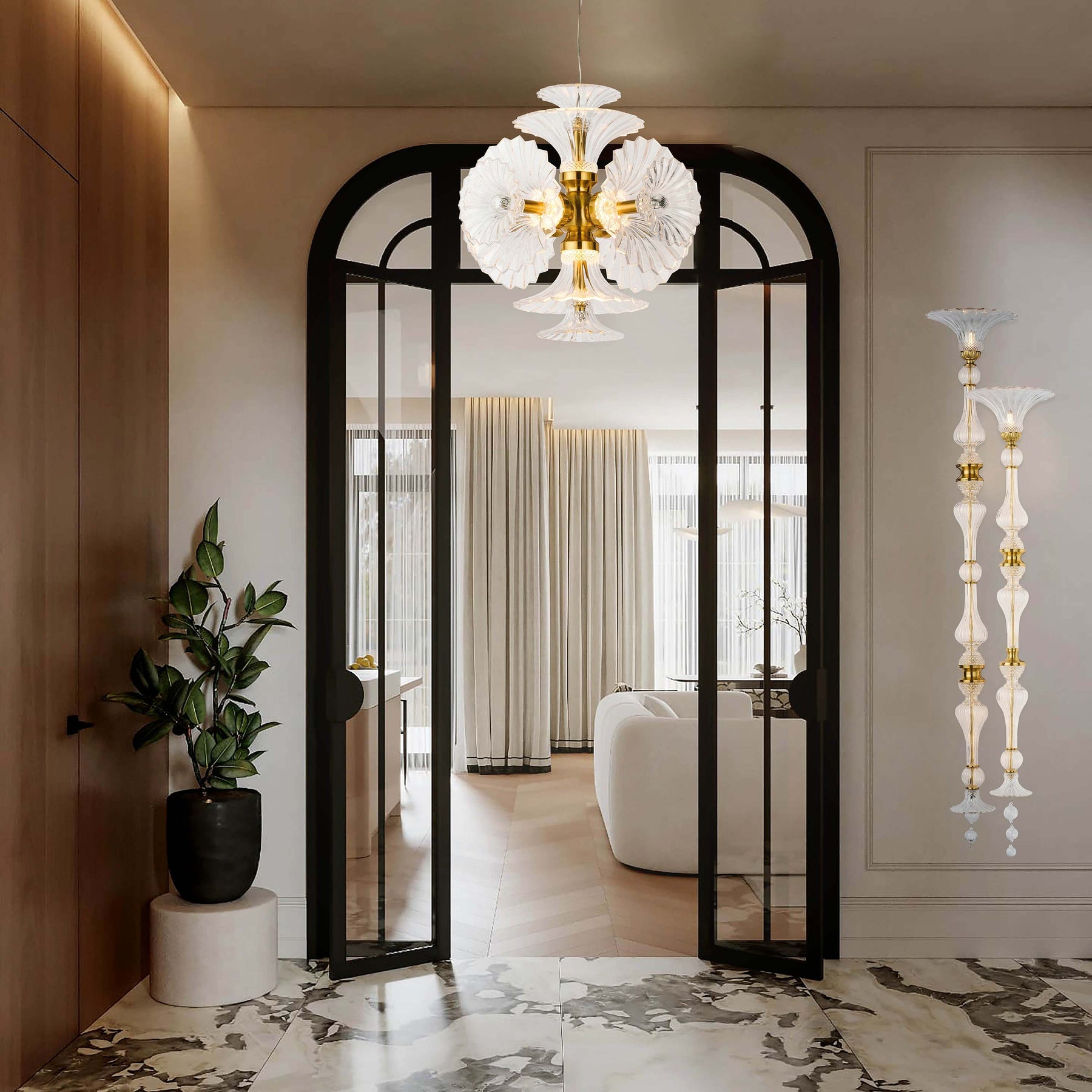 An Art Deco-inspired centrepiece in a compact form, the Petaluxe 520 Pendant Light features layered fluted glass petals around a brass core. Its symmetrical globe silhouette casts elegant shadows, perfect for entryways, round dining tables, or boutique spaces.