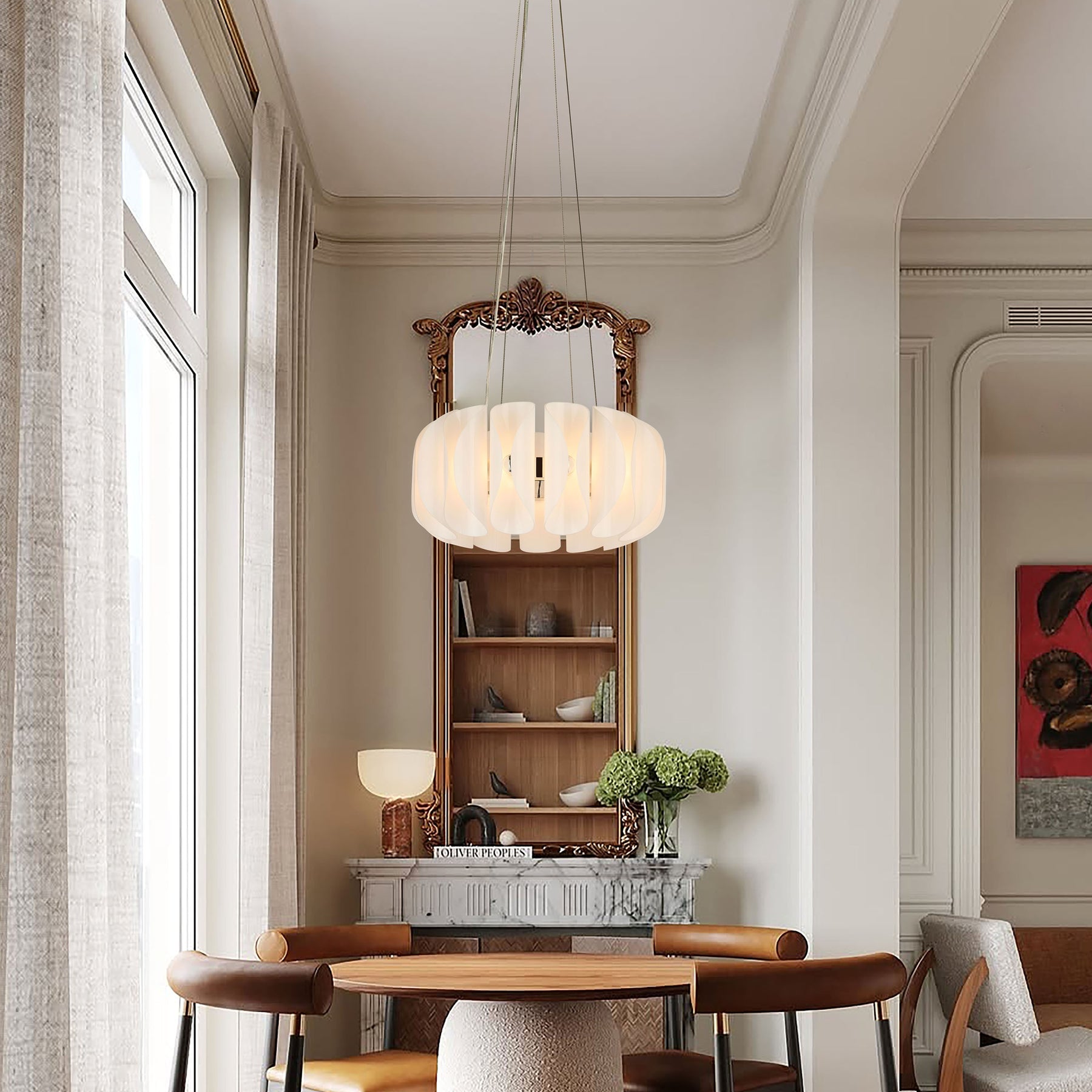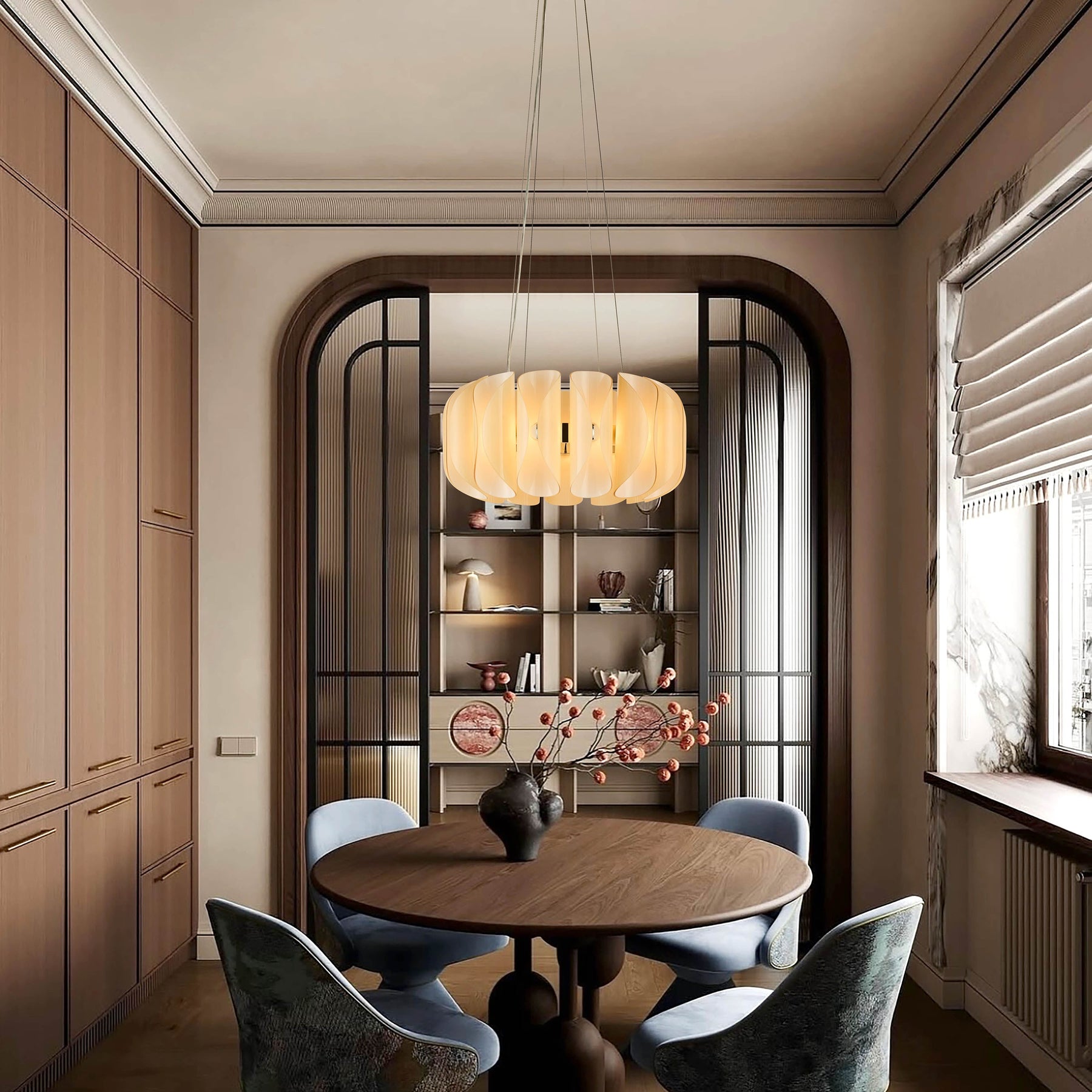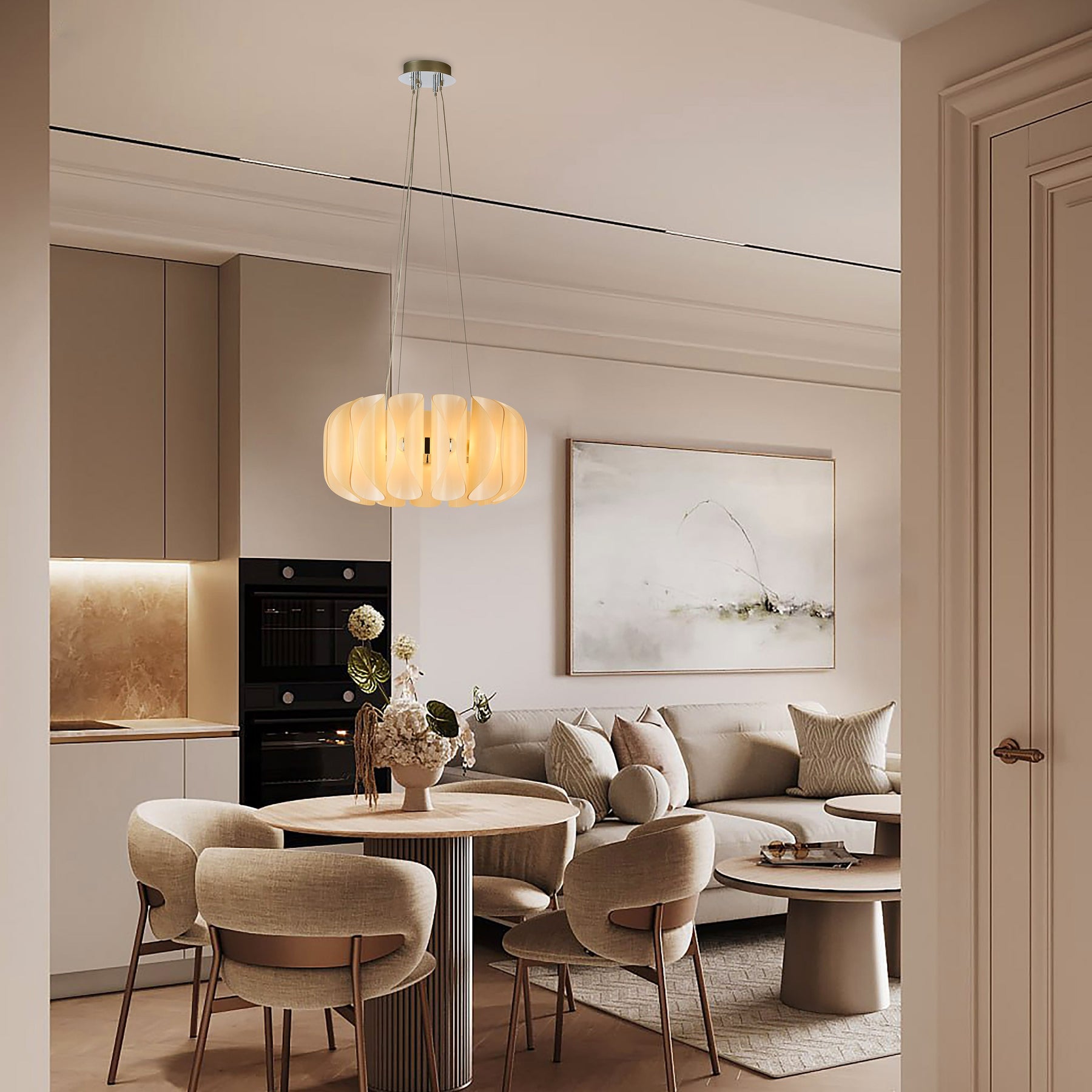 A sculptural centrepiece with a soft organic form, the Solvia 600 pendant light features delicately curved Opal White or Amber glass petals layered into a harmonious cluster. Perfectly proportioned for medium-sized spaces, it blends minimalist symmetry with an inviting glow.