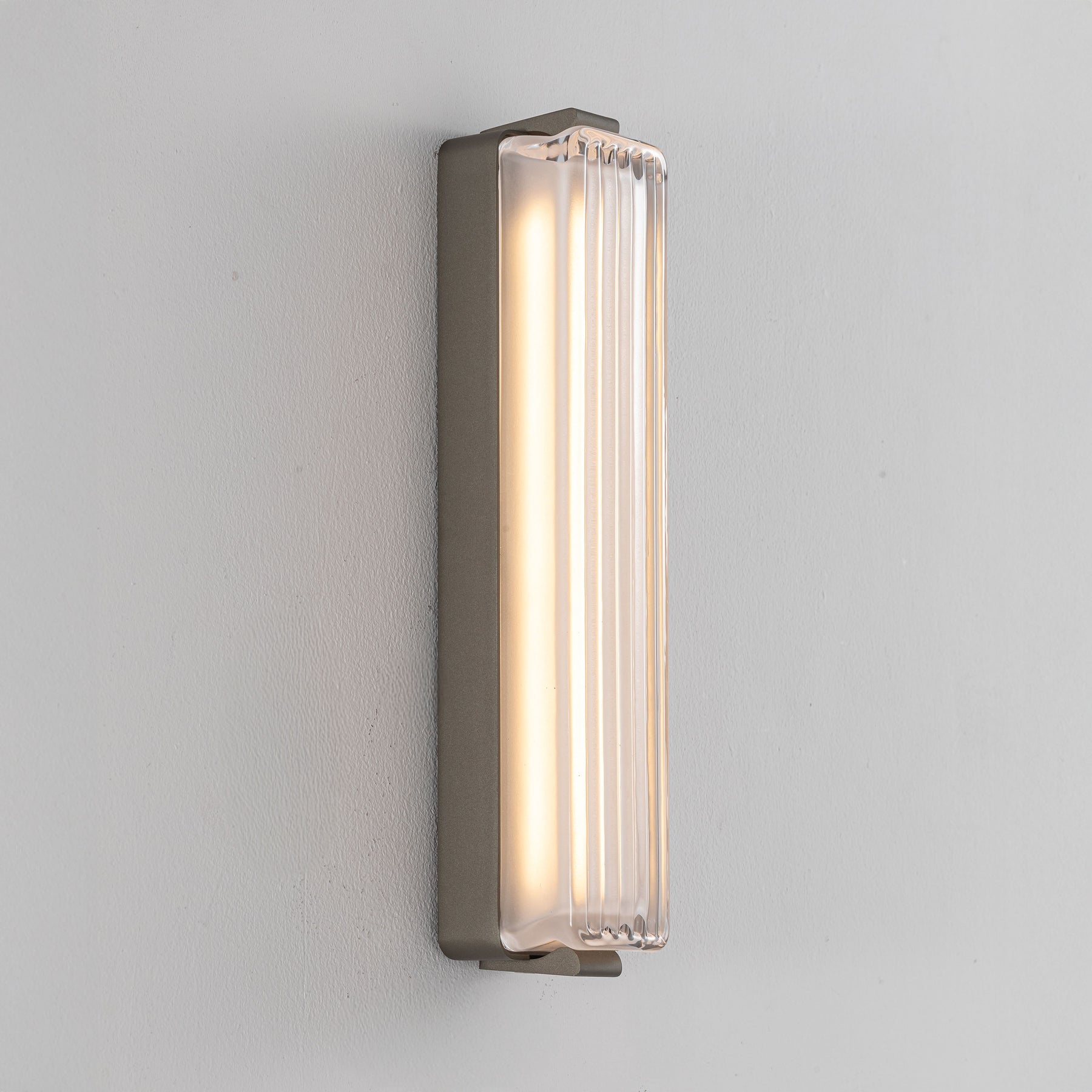 The Striato Wall Light extends the visual language of the Striato Series into vertical architectural surfaces. With a 310mm ribbed satin glass diffuser framed by a sleek gunmetal-finished structure, this sconce offers soft ambient illumination and a minimalist aesthetic.