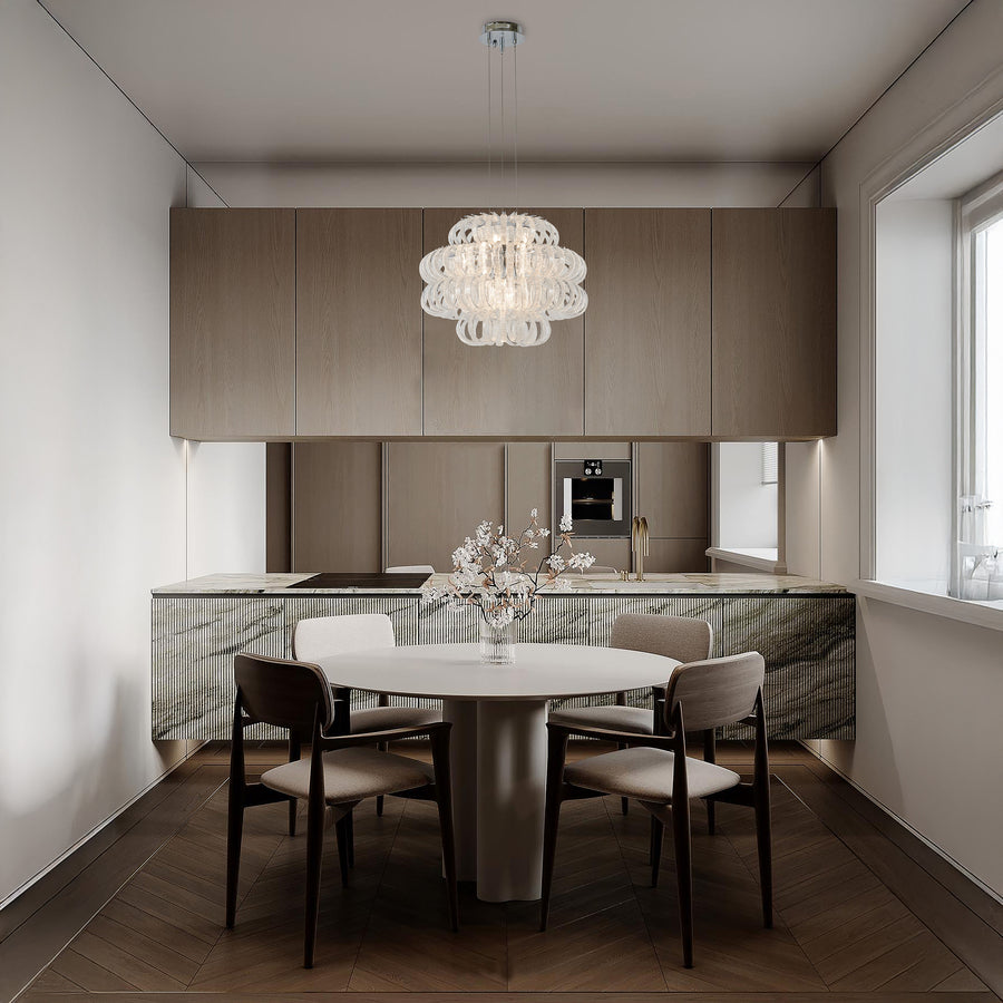 The Lussoria Collection embodies timeless sophistication with its cascading layers of handcrafted glass rings, reminiscent of fine jewelry. Each meticulously crafted glass piece captures and reflects light in a luxurious interplay of brilliance and shadow, creating a captivating statement for grand staircases, refined bedrooms, or elegant living spaces. Available in multiple sizes and configurations, Lussoria offers Italian-inspired opulence with the unique artistry of hand-blown glass.