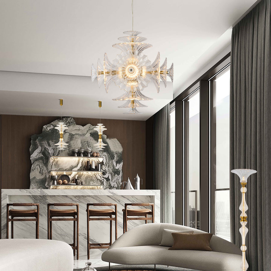 Bold yet graceful, the Petaluxe 750 Pendant Light embodies architectural symmetry with hand-formed glass petals radiating from a central brass core. Ideal as a statement above large tables or voids, this piece merges vintage elegance with modern impact.