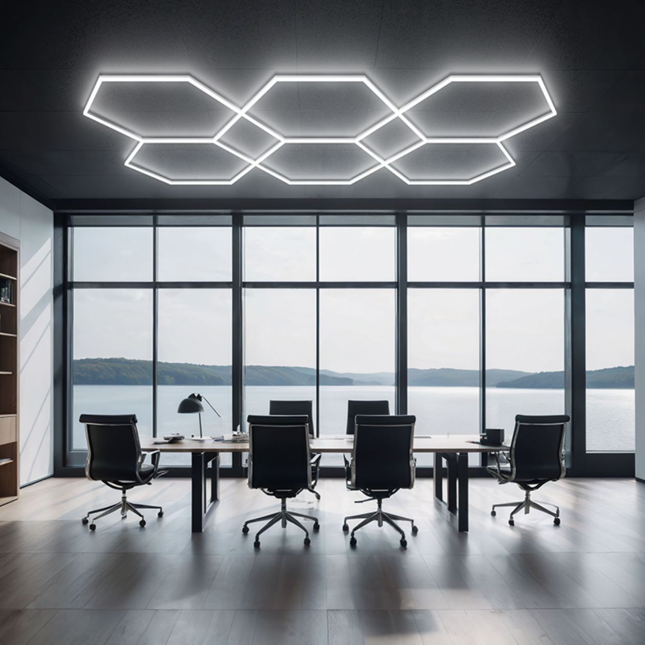 The Hexagrid Lighting System – Polygon Formation features a streamlined hexagonal layout with a bold, continuous pattern that delivers architectural rhythm and brightness. Its clean geometric lines elevate the ambiance of modern interiors — from car showrooms and gyms to offices and luxury retail spaces — offering both aesthetic impact and high-performance lighting.