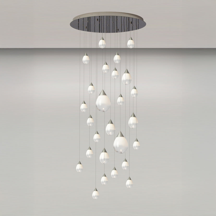 The Norden Frost Void can be fully customized to fit your project needs, including pendant sizes and ceiling plate dimensions. Its polished nickel finish perfectly complements the gradient glass, making it an ideal choice for grand staircases, lobbies, dining areas, or any space that demands an extraordinary focal point.