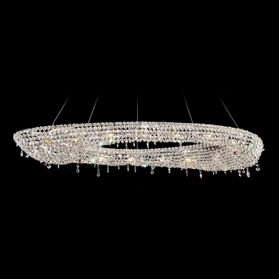Ideal for dining tables, conference rooms, or modern living areas, the Trinity Oval Chandelier 120 serves as an elegant focal point. Its unique shape, radiant crystal accents, and customizable dimensions make it a versatile addition to upscale residential and commercial spaces, offering both functionality and timeless style.