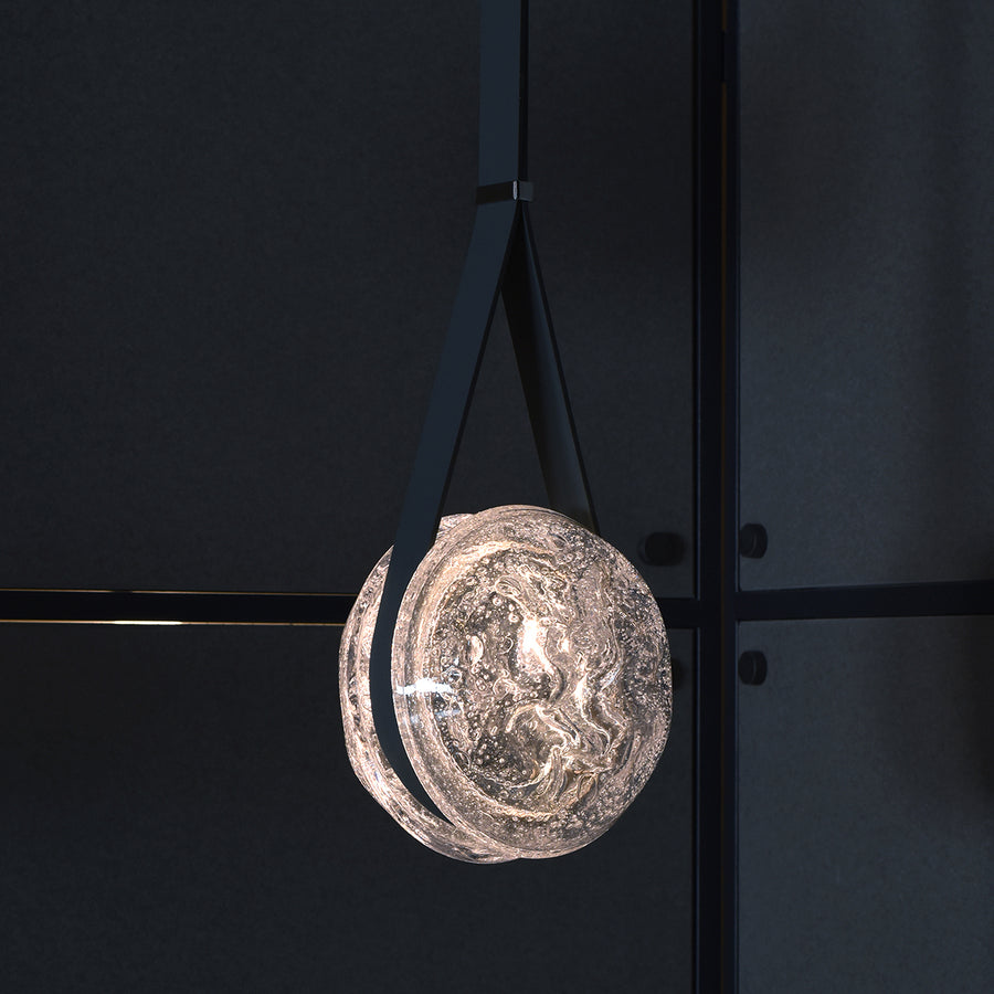 Honouring the true beauty of the night sky and each evocative moment it holds in its untouched corners, the Galaxy series takes you far away in the comfort of your own interior space. Bubbles rise and fall in a hand blown glass shade, highlighted from a glow within, producing the effect of starlight. The Galaxy Suspended variant with leather strap suspension makes a beautiful, tailored accent to a bedside or accent table or over a powder room vanity. The Galaxy series offers a number of different fittings including options for wall, ceiling, pendants and floor lamp. The variation in this range allows for anyone with any sized space to have a piece of the Galaxy within their home. Speak with our lighting consultants on how to incorporate the Galaxy into your home or project.