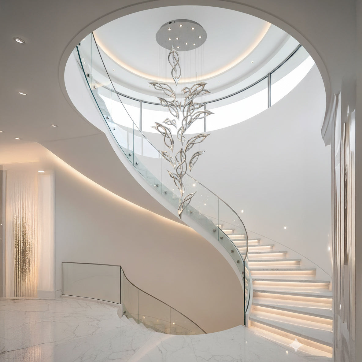 Each pendant leaf is suspended individually, allowing flexible composition – whether as a single statement drop, a vertical cascade for stairwells, or a wide arrangement tailored to specific architectural spaces. We offer full customization based on client drawings, including changes to quantity, height, layout, and finishes.