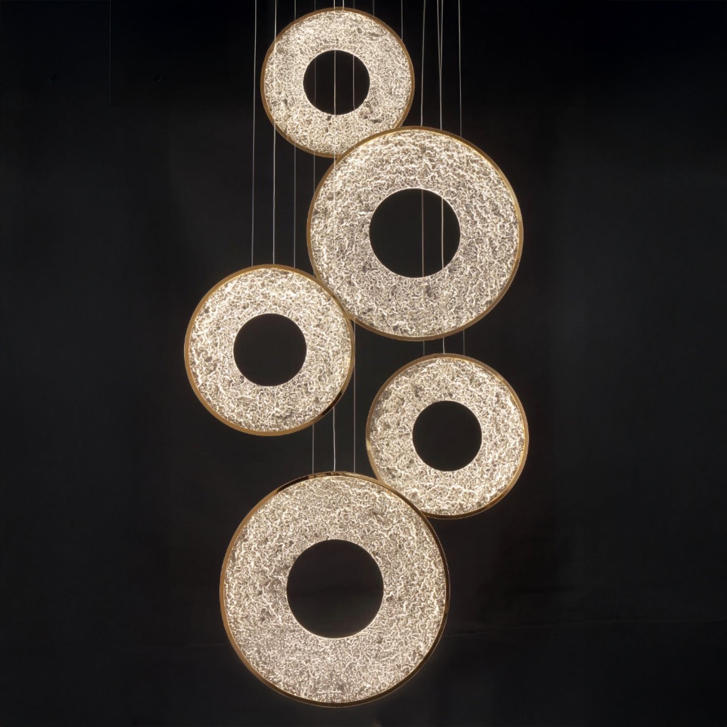 The Galactic Halo Pendant Light is a stunning centerpiece that combines artistic design with premium craftsmanship. Measuring L1240 x W380 x H3150mm, this magnificent fixture is composed of five elegantly arranged circular elements.