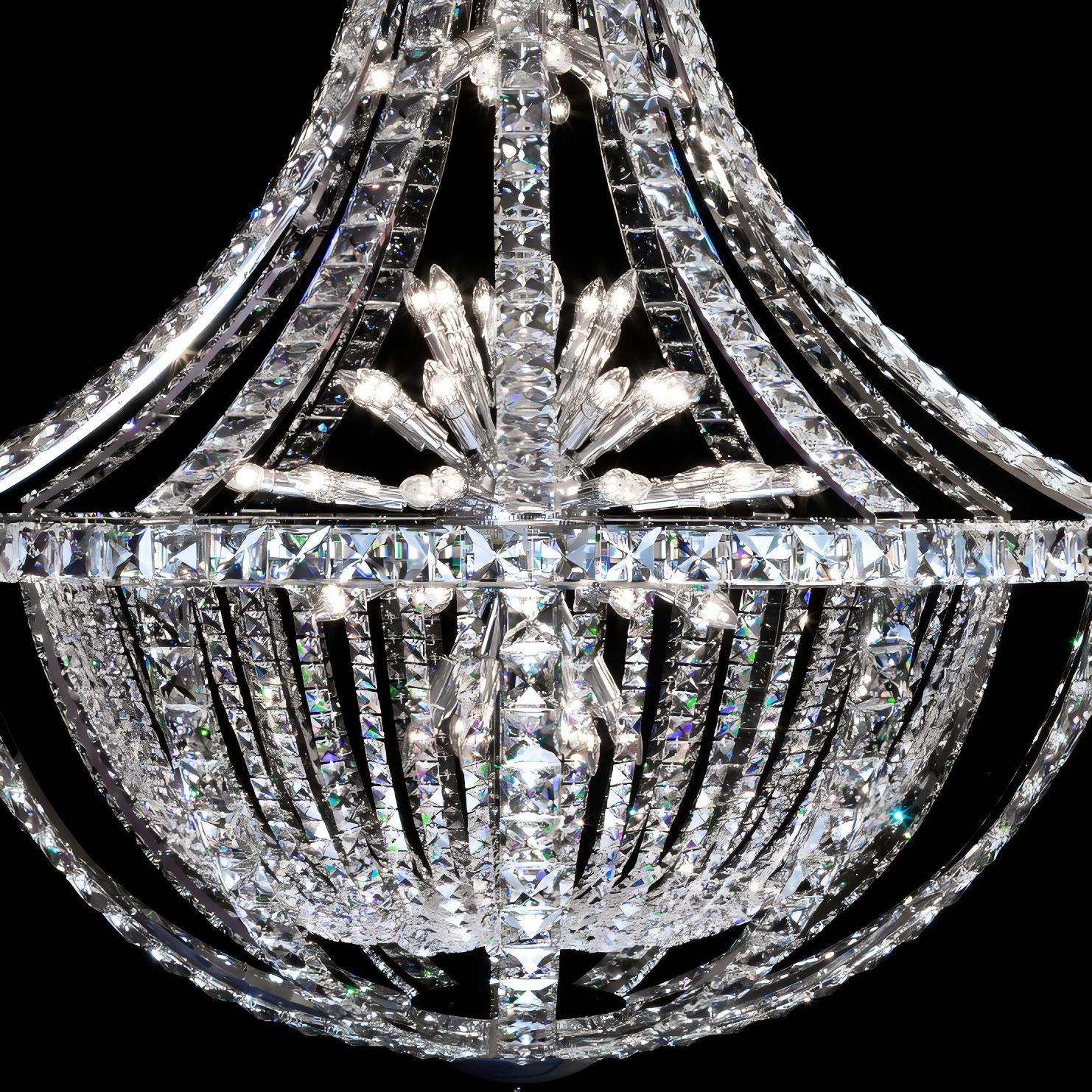 High-quality stainless steel frame with an electroplated chrome finish, enhanced by hand-cut Egyptian Asfour and K9 crystal accents, reflecting light to create a captivating glow.