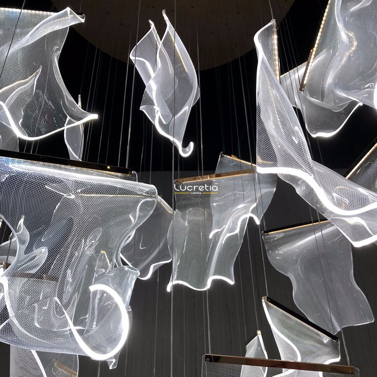 The Silken Custom Light Guide Plate Chandelier collection blurs the lines between luminaire and work of art. Constructed by heating optical acrylic then moulding it to create a unique sculpture each time, the Silken Custom Light Guide Plate Chandelier collection is one that is sure to add a focal point to any space. The LED’s reflect and bounce off the curves, creating depth and texture to the Silken Custom Light Guide Plate Chandelier– a truly beautiful luminaire.