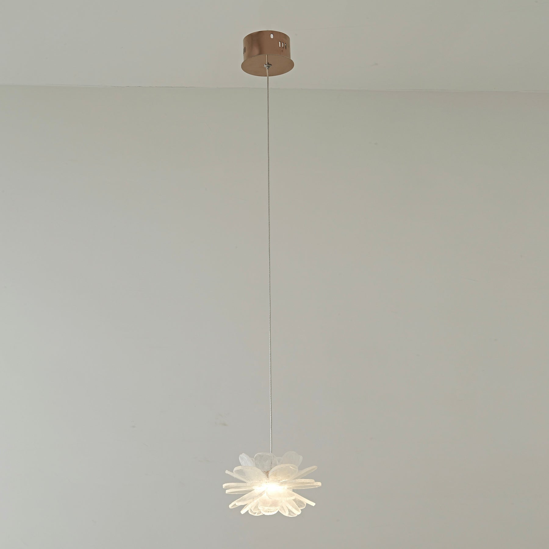 This handmade decorative pendant is composed of fine slivers of Brazilian rock crystal to form the delicate petals of a flower in full bloom, complete with pink rock crystal at the centre. With in-built LEDs providing a gentle glow setting off the organic texture of the crystal, the Vivi Custom Pendant is ideal as a decorative accent used single or in small sets in powder rooms, niches, bedsides and used en masse to create a stunning spray of glowing flora for large spaces such as dining and living areas, double height spaces and staircases. Also available as a wall lamp, the Vivi range is sure to delight with its fine detail and unique composition.