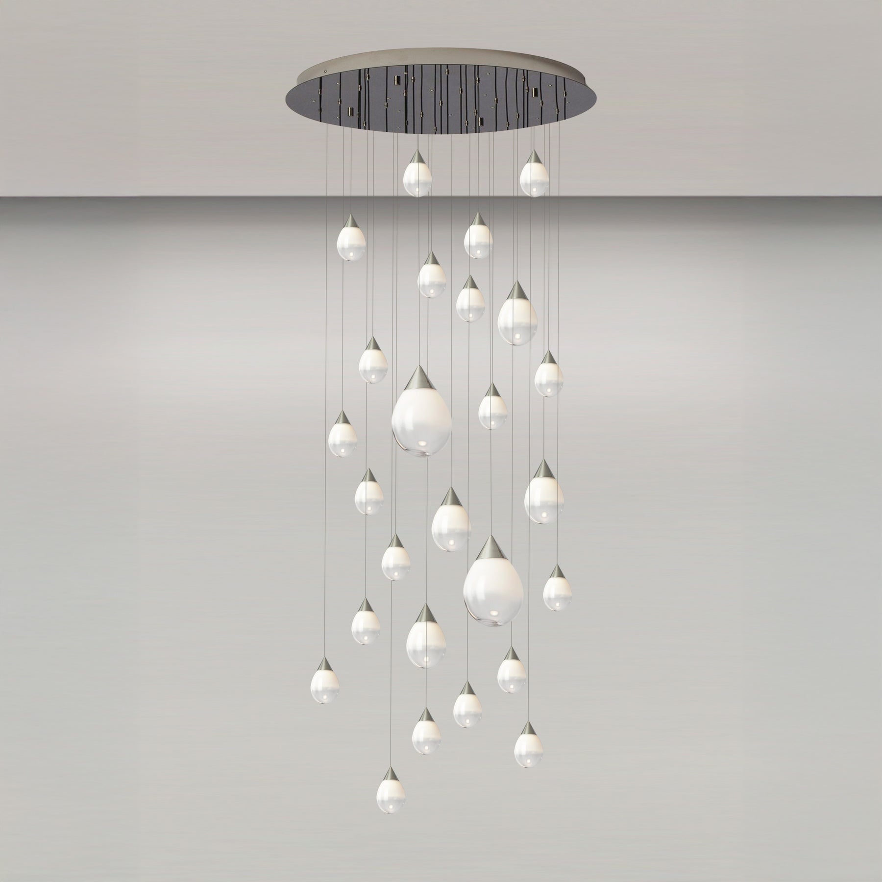 The Norden Frost is a modern gradient glass chandelier designed for stair voids and double-height interiors. Featuring 27 hand-blown glass pendants that transition seamlessly from clear to milky white, it creates a cascading architectural statement with soft, diffused illumination.