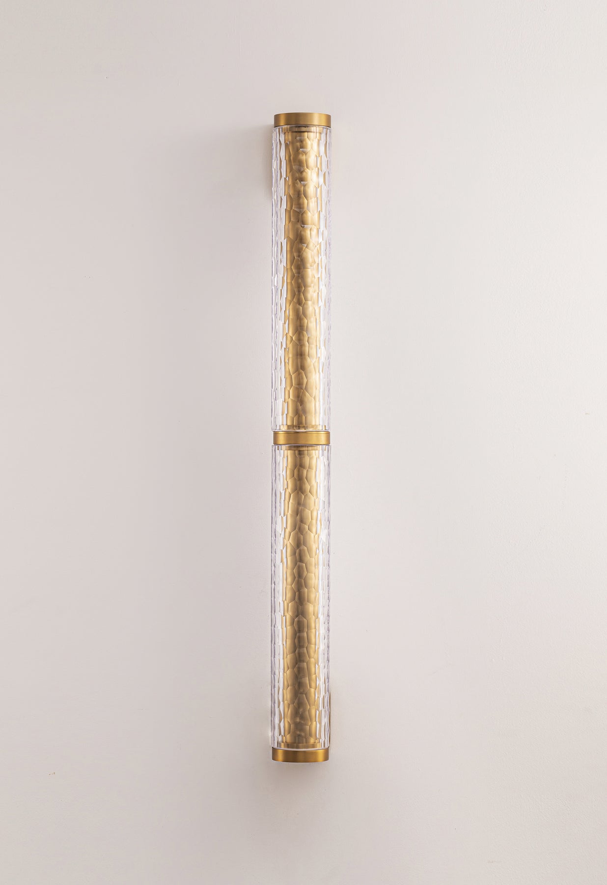 Crafted from premium European-imported glass, the textured surface softly diffuses light while creating depth and subtle visual movement. The extended form enhances both illumination and presence, making it ideal for feature walls, hallways, and architectural interiors.
