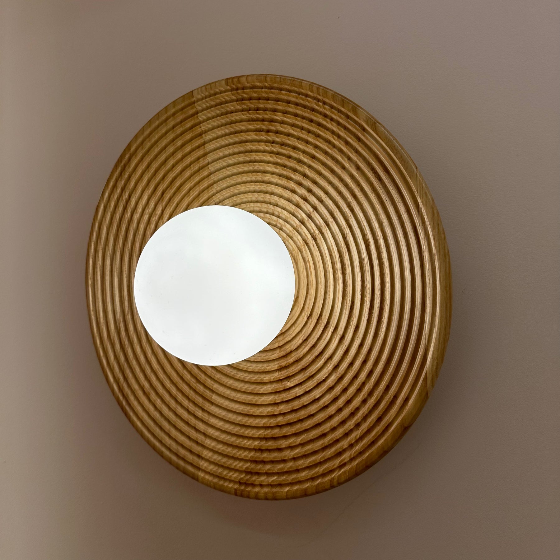 The ZenWood Round Wall Lamp is a stunning embodiment of Wabi-Sabi style, measuring 280mm in diameter. Crafted from natural birch-colored timber, this elegant wall lamp features a forest glass ball at its center, creating a harmonious blend of nature and artistry. Ideal for both residential and commercial spaces, the ZenWood Round Wall Lamp adds a touch of serene beauty and rustic charm to any interior. Illuminate your space with the timeless elegance of this unique wooden wall lamp.